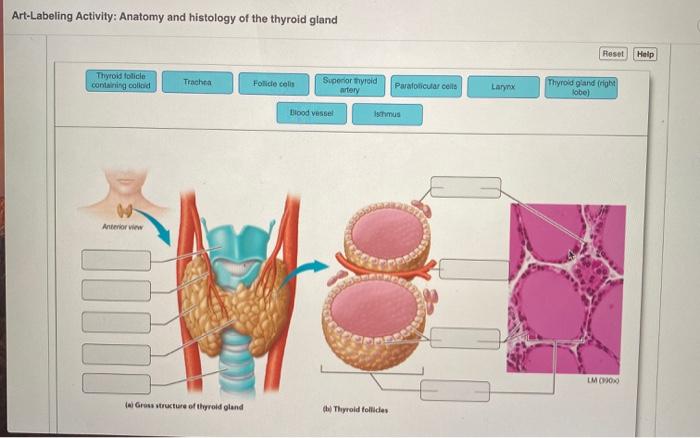 Bio 169 - H101 Hy Course Home Art-Labeling Activity. -aring Reset Help Thyroid gland right lobe Parafollicular cells Isthmus Trachea Follicle cells Thyroid follicle containing colloid Larynx. Anatomy and histology of the thyroid gland Anterio view LM 390x a Gross structure of thyroid gland b Thyroid follicles Course Chat MacBook Pro.